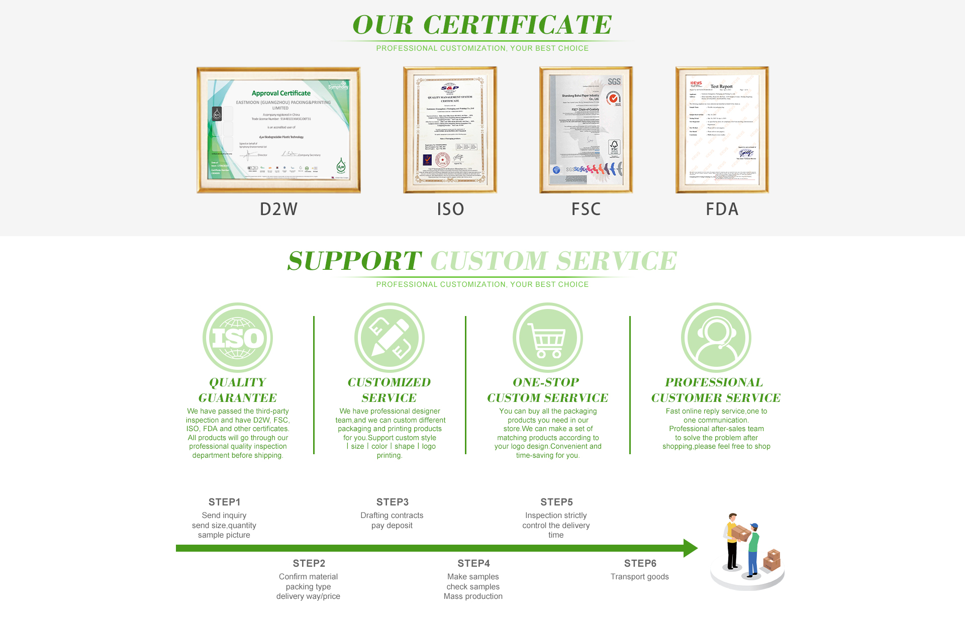 Eastmoon Packaging And Printing Co., Ltd. specializes in customizing all kinds of packaging bags, boxes, card, packing accessories and so on.We support one-stop custom service,you can buy all the packaging you need from us at one time,which can save your time.