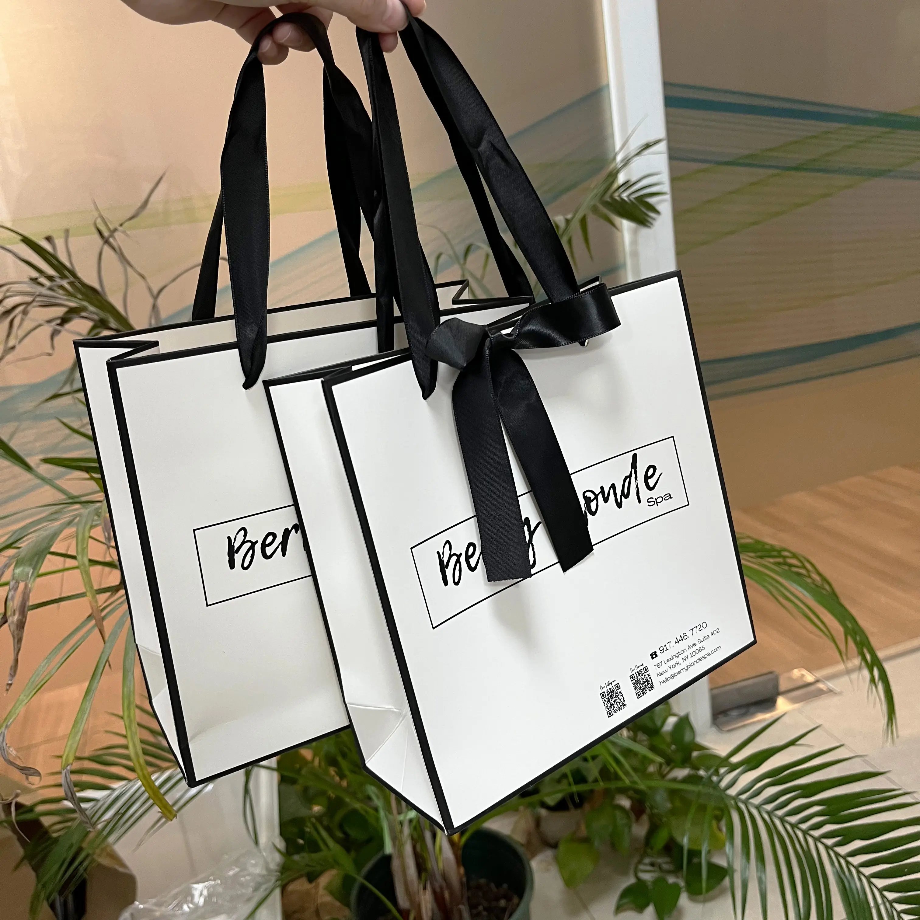 Customized logo luxury white shopping paper bag with ribbon