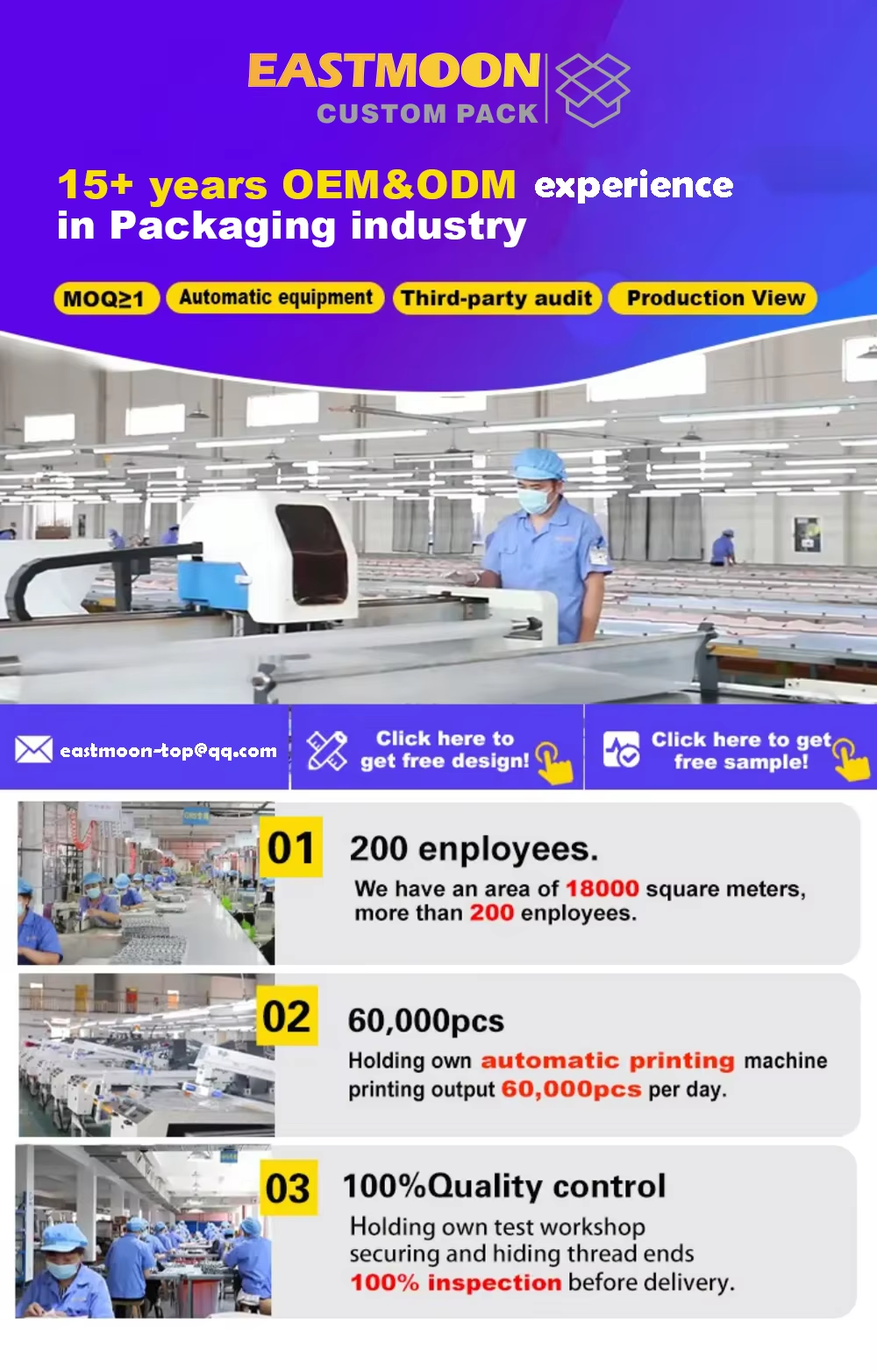 Eastmoon Packaging And Printing Co., Ltd. specializes in customizing all kinds of packaging bags, boxes, card, packing accessories and so on.We support one-stop custom service,you can buy all the packaging you need from us at one time,which can save your time.
